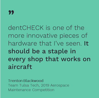 Retiring experienced maintenance professionals means that skillset that would traditionally take years to master (In this particular case, 20 years), now need to be mastered by new hires within a short amount of time. “dentCHECK is one of the more innovative pieces of hardware that I’ve seen. It should be a staple in every shop that works on aircraft”, said Trenton Blackwood, one of the student competitors from Team Tulsa Tech.